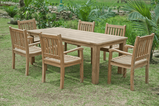Wer ein stimmungsvolles Sitzensemble für sechs Personen aus massivem Teakholz sucht, trifft mit diesem Gartenset, bestehend aus Teaktisch und 6 Beaufort Gartenstühlen, eine ausgezeichnete Wahl. Die Sitzgruppe überzeugt mit einem zeitlos-eleganten Design und hoher Funktionalität. Die 220 cm lange Tischplatte wirkt kompakt, obwohl sie aus einzelnen Holzplanken zusammengesetzt wurde. Diese Bauweise ist bei Gartentischen aus dem Naturmaterial Holz unbedingt erforderlich, da die auf diese Weise entstandenen Zwischenräume dem Teakholz Platz zum Ausdehnen und Zusammenziehen geben. Darüber hinaus wird Regenwasser auf den Boden abgeleitet.
