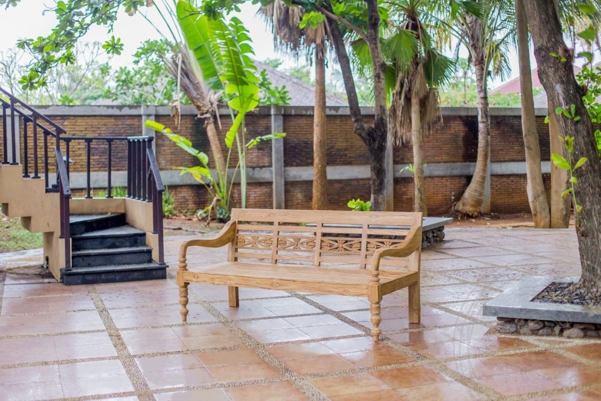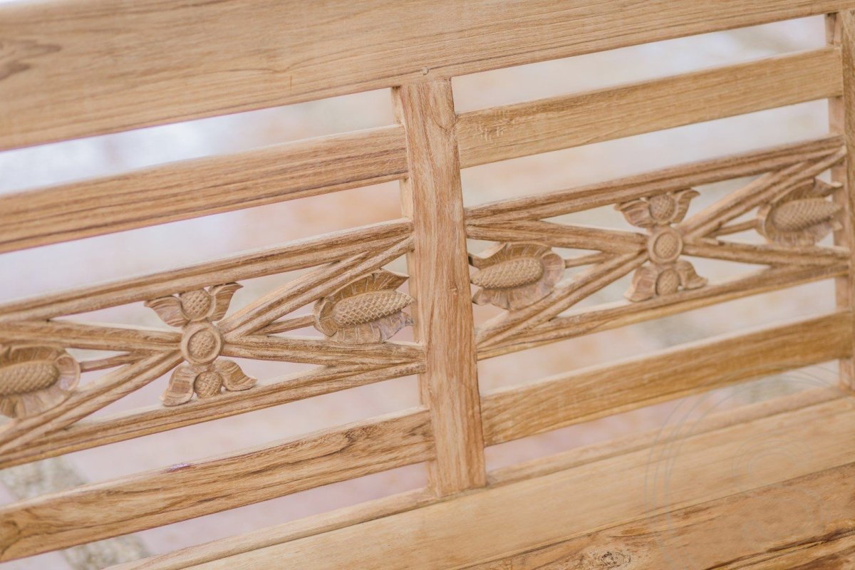 - Details: Die Rückenlehne ist mit feinen Holzschnitzereien verziert und verleiht der Bank eine elegante Optik.