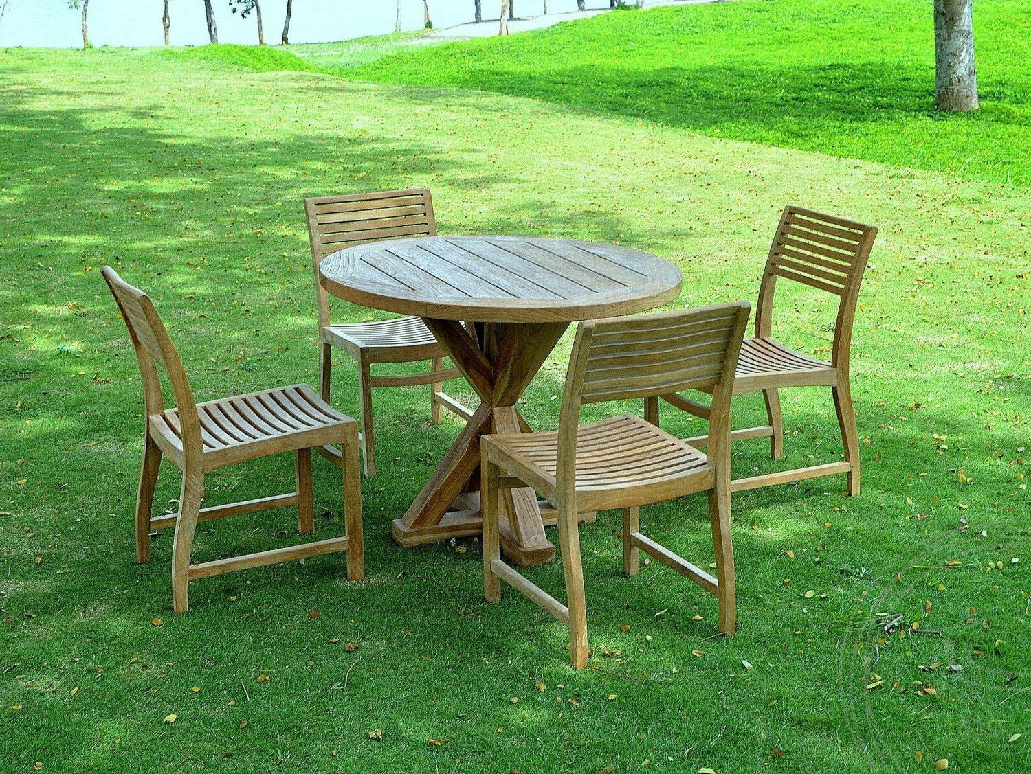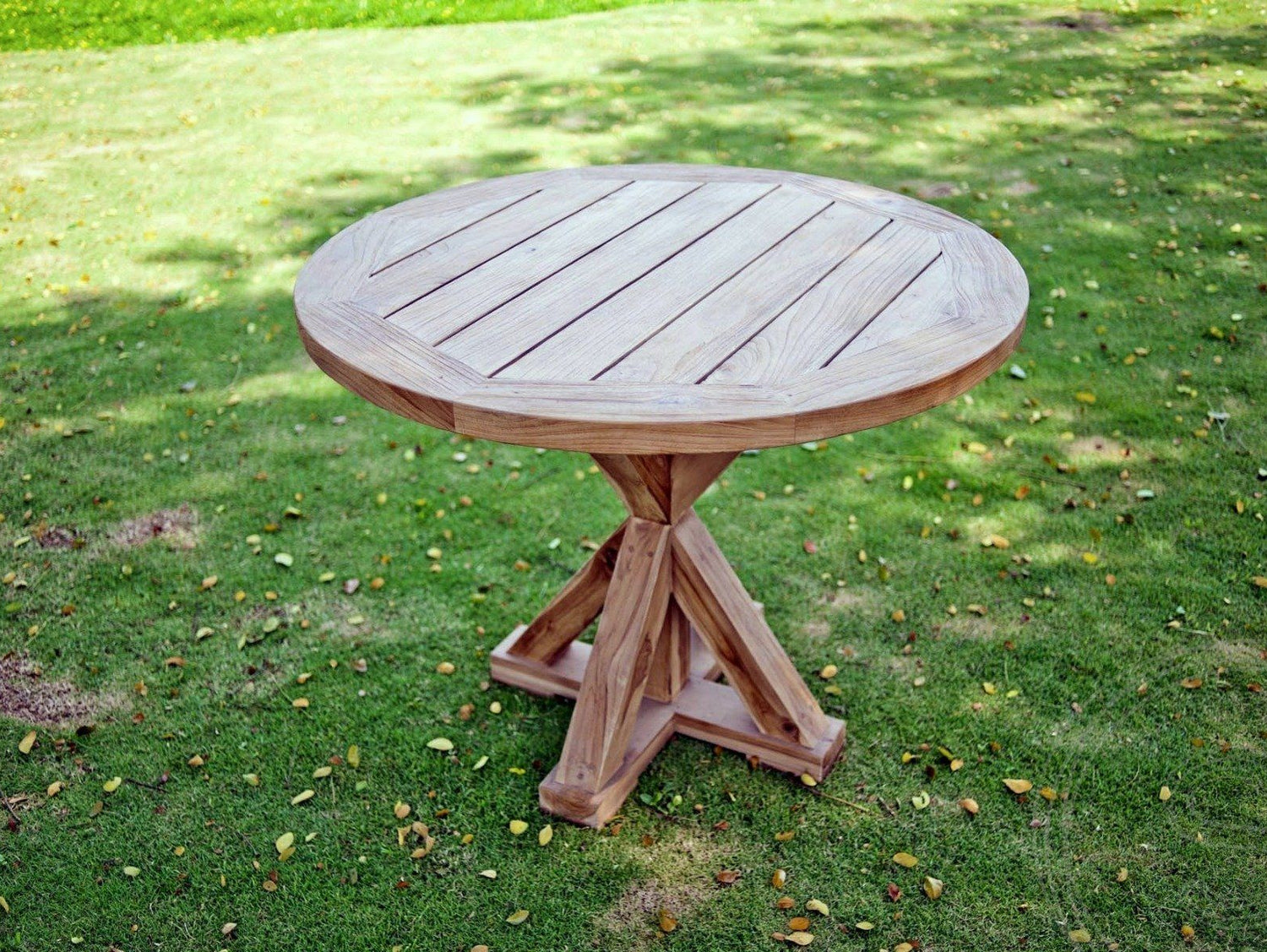 Ein Blickfang im Außenbereich und zugleich ein praktischer Einrichtungsgegenstand ist dieser Gartentisch aus massivem Teakholz mit runder Tischplatte. Sie hat einen Durchmesser von 100 cm und wurde aus einzelnen Holzleisten zusammengesetzt, die an der Außenseite von einem Teakholz-Rahmen eingefasst werden. Die Tischplatte ruht auf einem Sockel mit gekreuzten Beinen. Vier Kanthölzer bilden den Unterbau. Sie enden auf einer kreuzförmigen Sockelplatte am Boden. Dieses auffällige Detail macht den Gartentisch zum Eyecatcher im Garten und auf der Terrasse.
