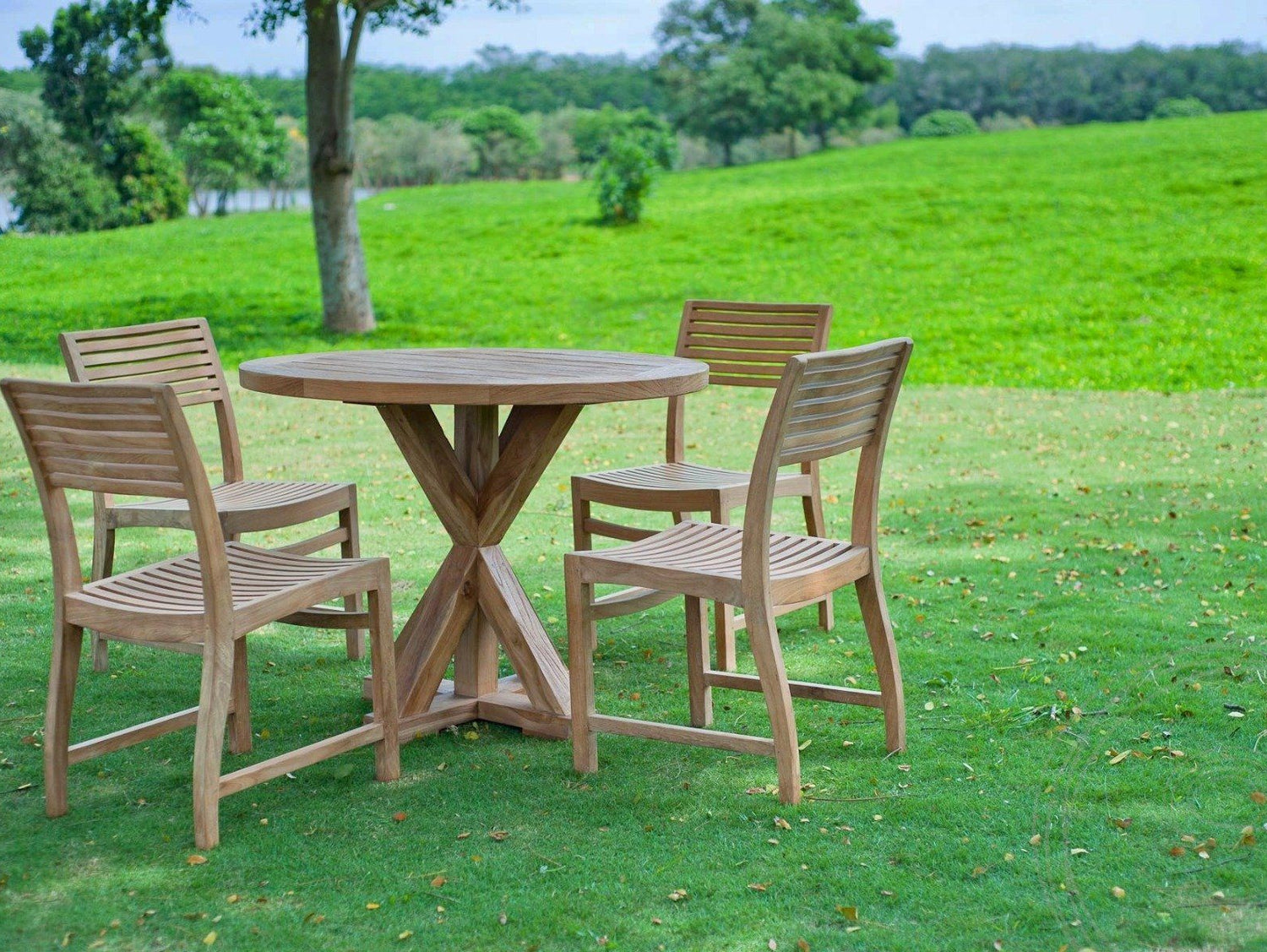 An der Tischplatte mit 100 cm Durchmesser finden bis zu vier Personen Platz. Eine authentische Ergänzung bilden Teak Stühle für den Außenbereich mit oder ohne Lehne. Das Teakholz überzeugt mit einer natürlichen warmen Ausstrahlung. Das helle Hartholz dunkelt im Lauf der Zeit nach und bildet eine silbergraue Patina aus. Um ein restloses Ablaufen des Regenwassers zu gewährleisten, wurde die Tischplatte nicht aus einem kompakten Holzstück gefertigt. Zwischen den einzelnen Brettern befinden sich schmale Rillen, durch die das Wasser nach unten entweichen kann. Eine durch Staunässe hervorgerufene Fleckenbildung wird auf diese Weise verhindert.