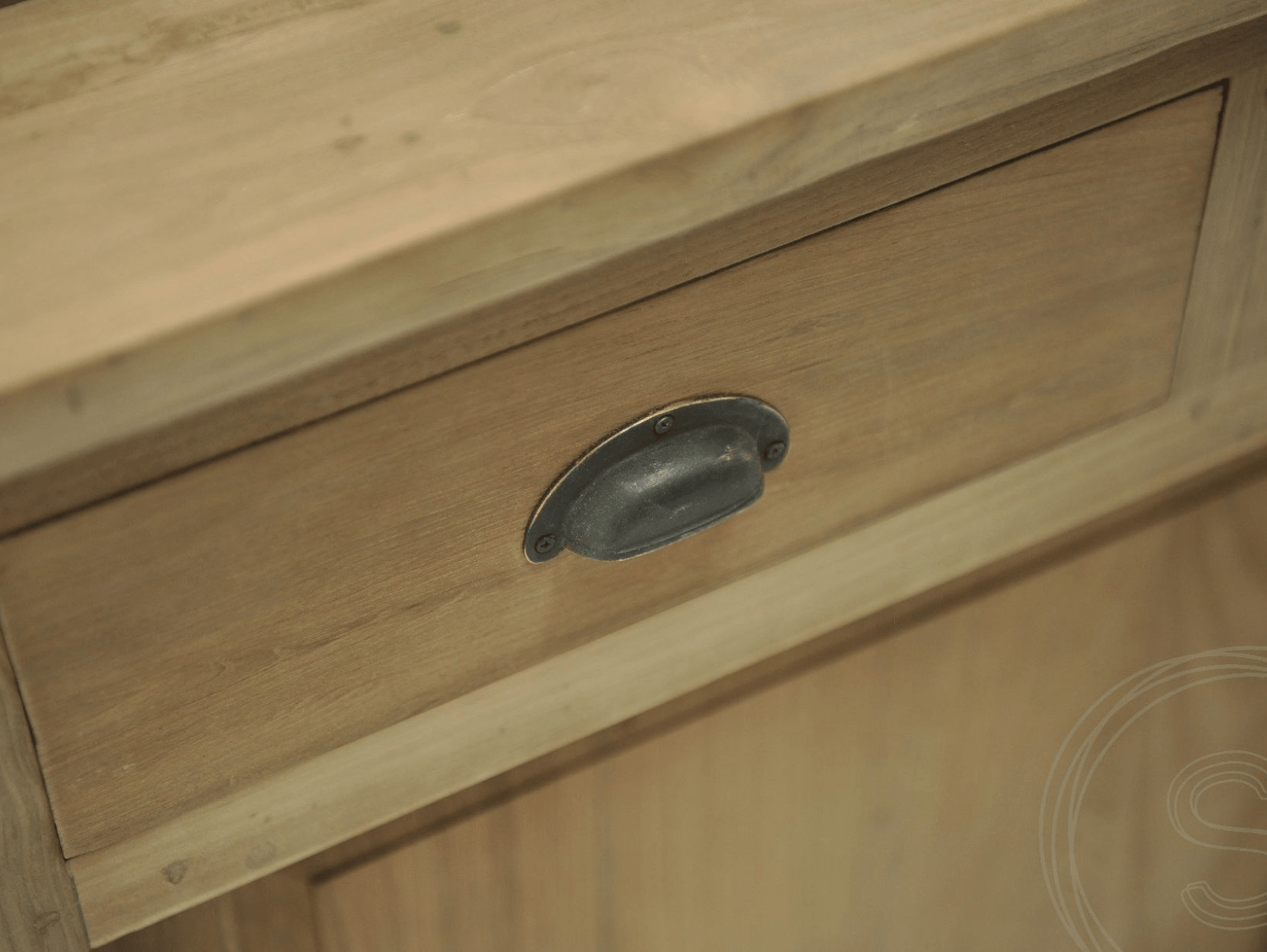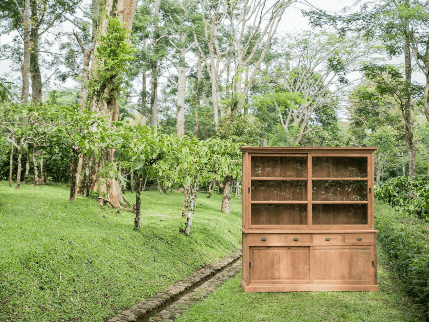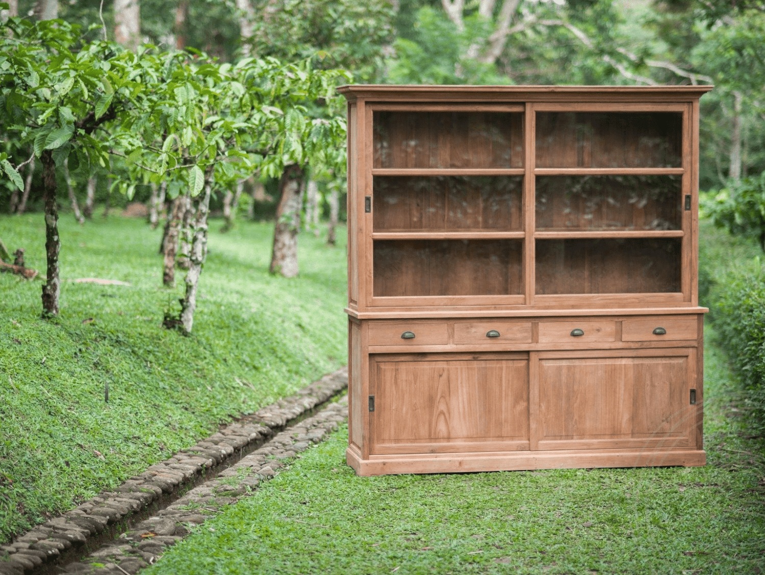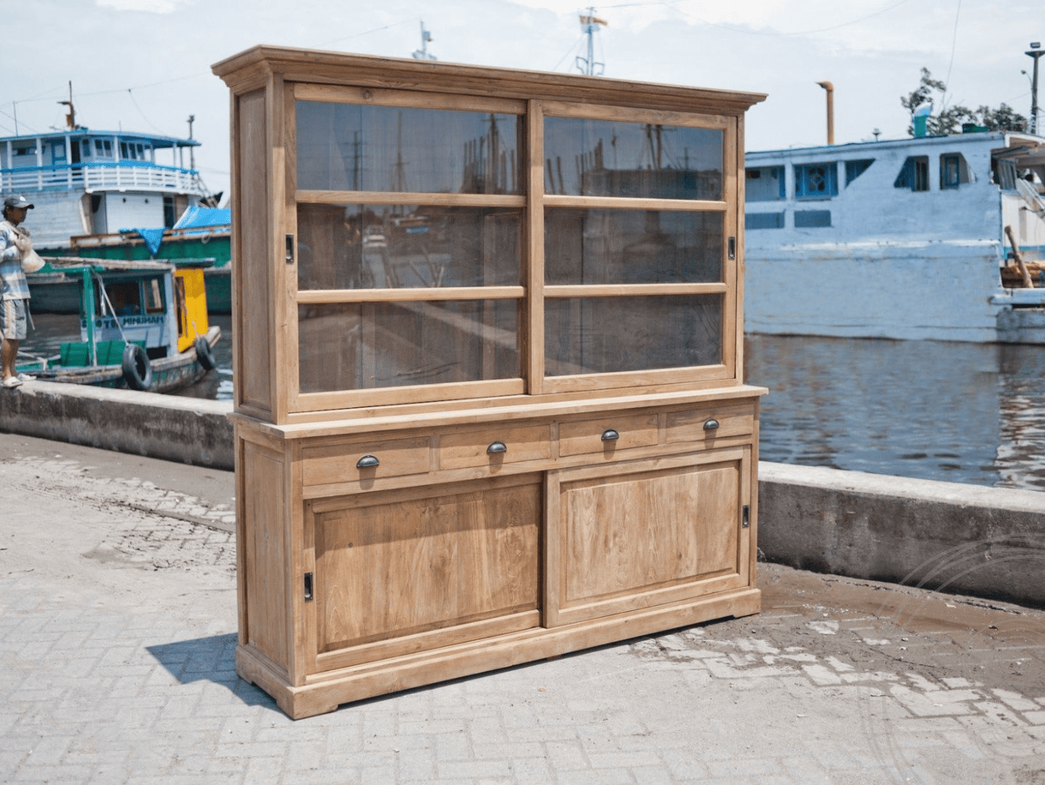 Vitrinenschränke sind zeitlose Möbelstücke, die in zahlreichen Haushalten ein fester Bestandteil der Einrichtung sind. Ein Vitrinenschrank aus massivem Teakholz, wie dieses 200 cm lange Modell, setzt einen punktuellen Glanzpunkt in den heimischen vier Wänden. Das für die Herstellung verwendete Teakholz wurde glatt abgeschliffen, bis die Oberfläche in einem samtig-matten Glanz erstrahlte. Vor dem hellen Hintergrund des Naturmaterials zeichnet sich die Maserung als unregelmäßiges Muster aus feinen dunklen Linien ab. Der Teak Vitrinenschrank wurde in einer Möbelmanufaktur in Indonesien hergestellt. Mit diesem Einrichtungsgegenstand holen Sie sich ein Stück südostasiatisches Lebensgefühl in das eigene Heim.