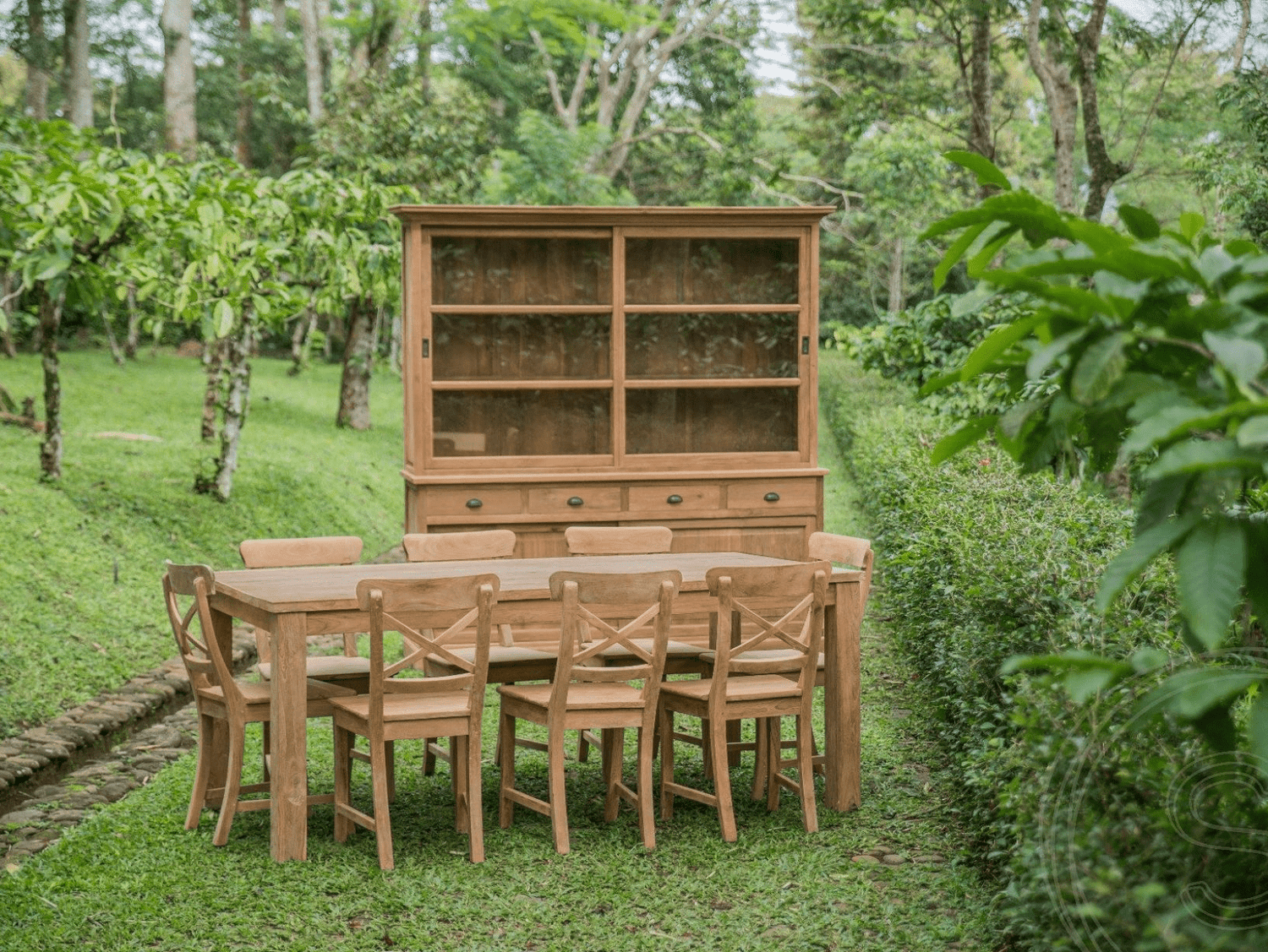 Teakholz ist pflegeleicht. Regelmäßiges Reinigen mit einem feuchten Tuch und einer milden oder grünen Seifenlösung hält das Holz in gutem Zustand. Bei Teakholz-Gartentischen empfehlen wir mindestens 1-2 Mal im Jahr eine gründliche Reinigung, um Ablagerungen wie Algen oder Moos vorzubeugen. Bei Tischen mit Schraubbeinen jährlich prüfen, ob alles fest sitzt.