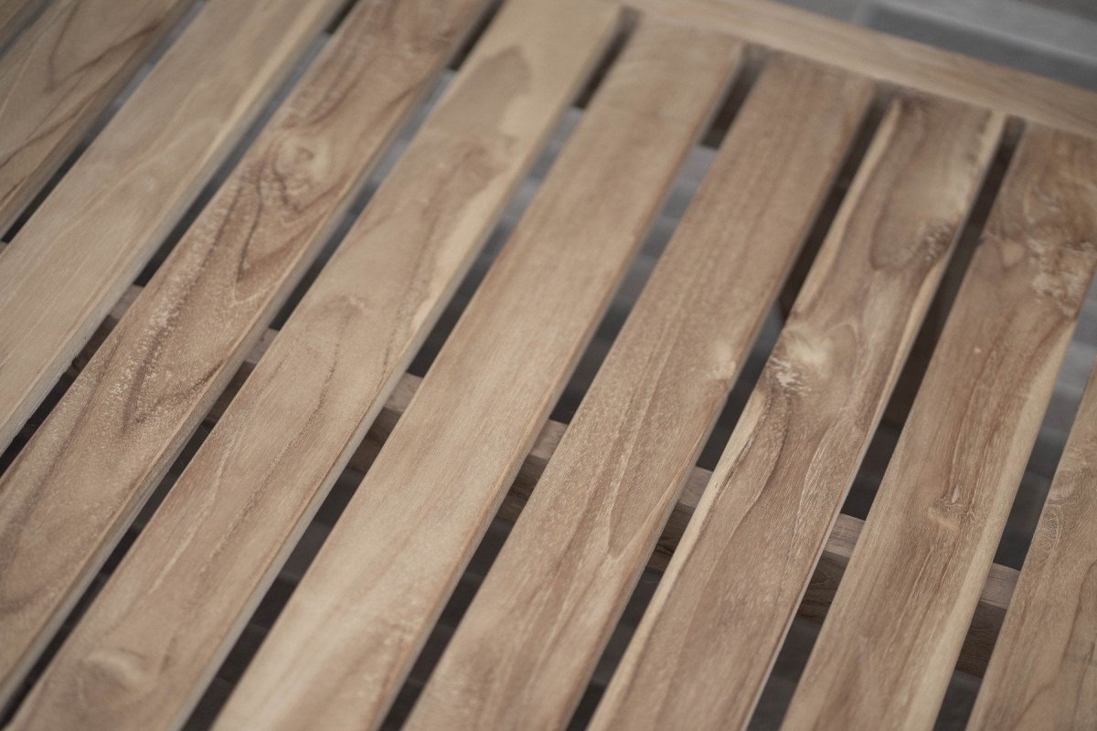 Teakholz ist sehr pflegeleicht. Reinigen Sie es regelmässig mit einem feuchten Tuch und milder oder grüner Seife, um es in gutem Zustand zu halten. Für Teak Gartentische empfehlen wir ein- bis zweimal pro Jahr eine gründliche Reinigung, um Ablagerungen wie Algen oder Moos zu vermeiden. Bei Tischen mit Schraubbeinen sollte jährlich geprüft werden, ob alle Verbindungen fest sitzen.